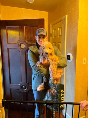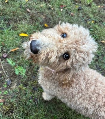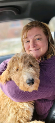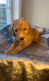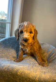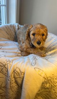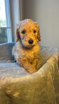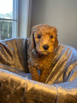 “Maximilian (Cider) is such a sweet boy. There isn’t a mean bone in his body. He loves people and other animals. He did really well in his obedience training and listens to commands. He doesn’t shed at all his fur is very therapeutic. He’s been a fantastic addition to the family and so much easier to train than I was expecting. He’s by my side whenever I’m home - my puppy pal. I found him online with Golden Pine Doodles and once I reached out, the process couldn’t have been more simple. It was a really great experience and they equipped me with everything I needed to bring the pup home to meet the family. I highly recommend this breeder. They are very thoughtful and super easy to work with.” - Cisco Cruz, dad of Cider, now Maximilian